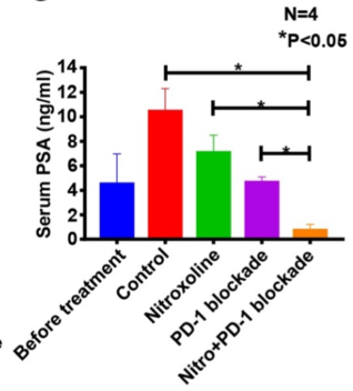 Figure 5. (G) Serum prostate-specific antigen levels were significantly lower in the nitroxoline plus PD-1 blockade group than in the control, nitroxoline, and PD-1 blockade groups. Data are presented as mean ± standard deviation (N = 4, *P < 0.05).