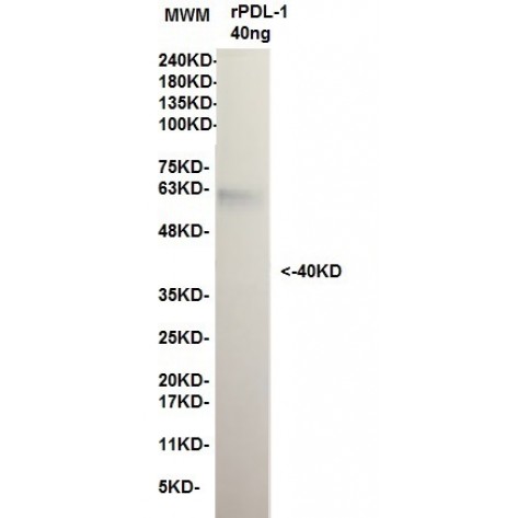 Western blot: Western Blot: Anti-PD-L1 clone 12D9 detected 40ng recombinant PD-L1 on Western Blot. The blot was stained with HRP substrate 4-Chloro-1-Naphthol.