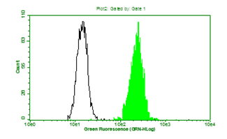 1. Fluorescence flow cytometry: Above is the histogram of Hela cells stained with 10μg/mL anti-CA 125 mAb clone 23 and fluorescence-labelled secondary antibody. Black line represents the histogram of Hela cells stained with control antibody, mouse anti-TB 38Kd antigen mAb clone B12F8 (MO-I40021D).